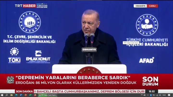 Cumhurbaşkanı Recep Tayyip Erdoğan, 6 Şubat depremlerinde devlet olarak dakikalar içerisinde harekete geçildiğini dile getirip '86 milyon olarak küllerimizden yeniden doğduk.' dedi. Erdoğan, deprem bölgesindeki çalışmaları anlatırken muhalefete de tepki gösterdi.